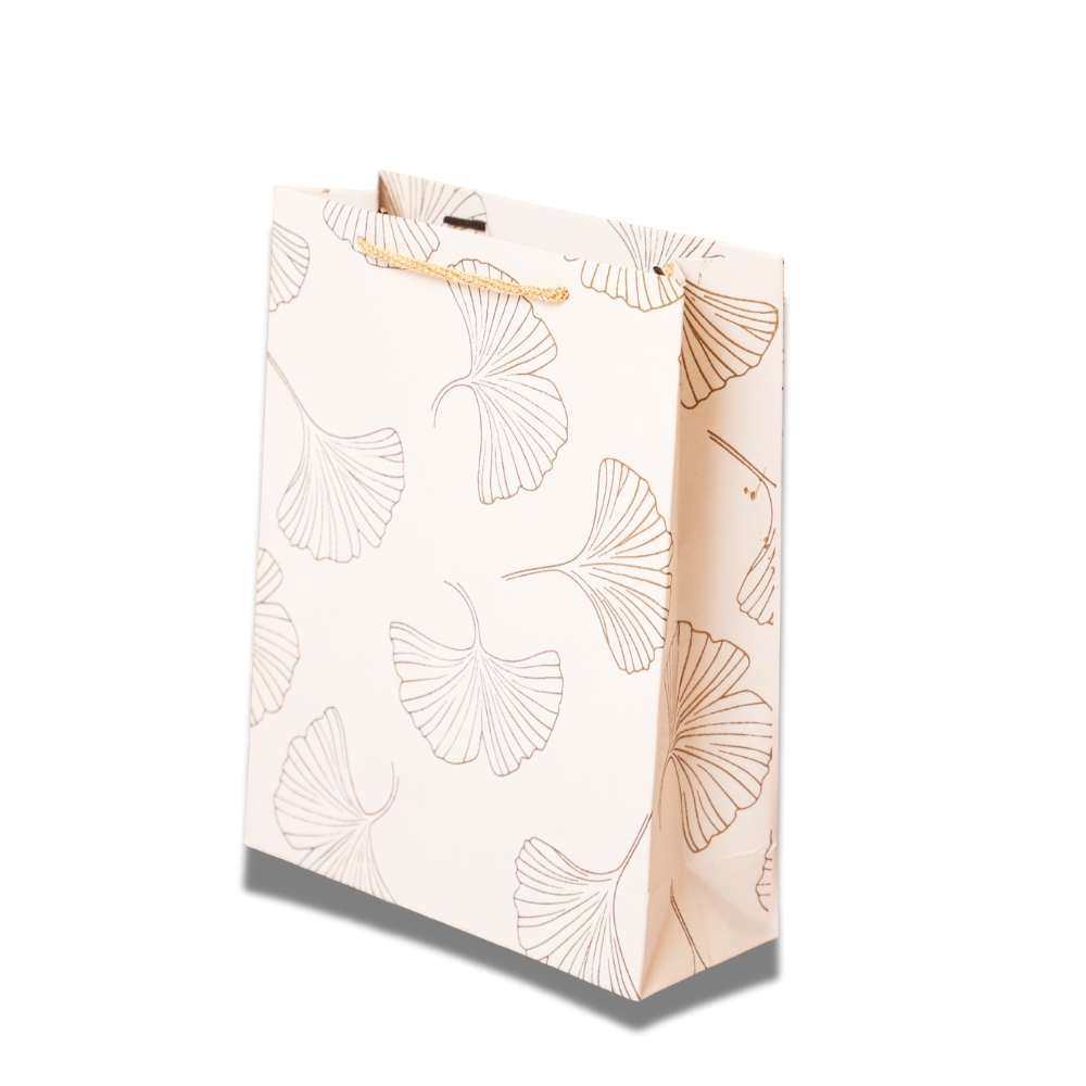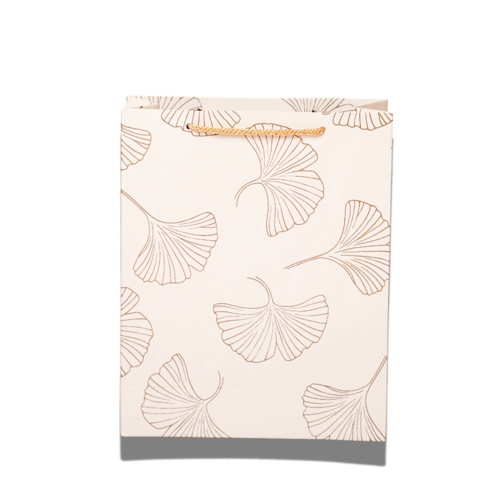 Elevate your gifts with our elegant white & gold Ginkgo leaf patterned paper bag. Perfect for any special occasion. Shop now!