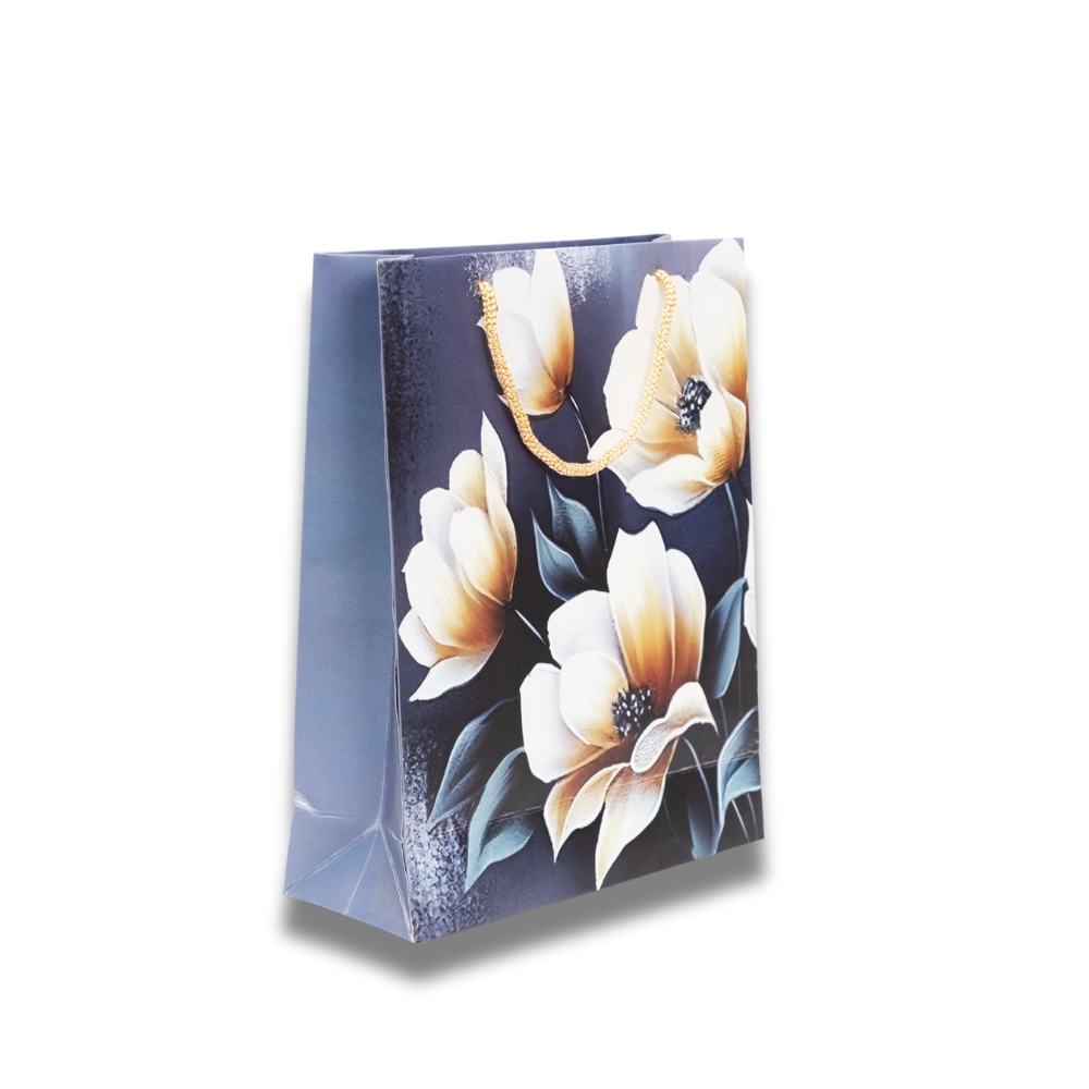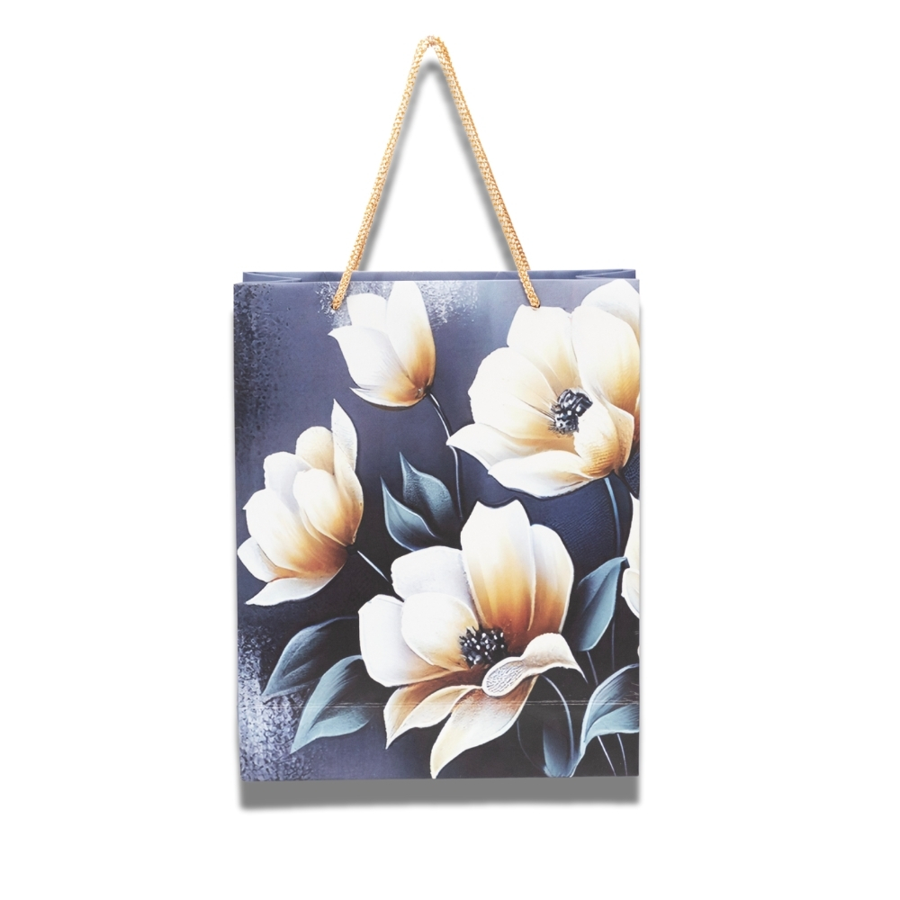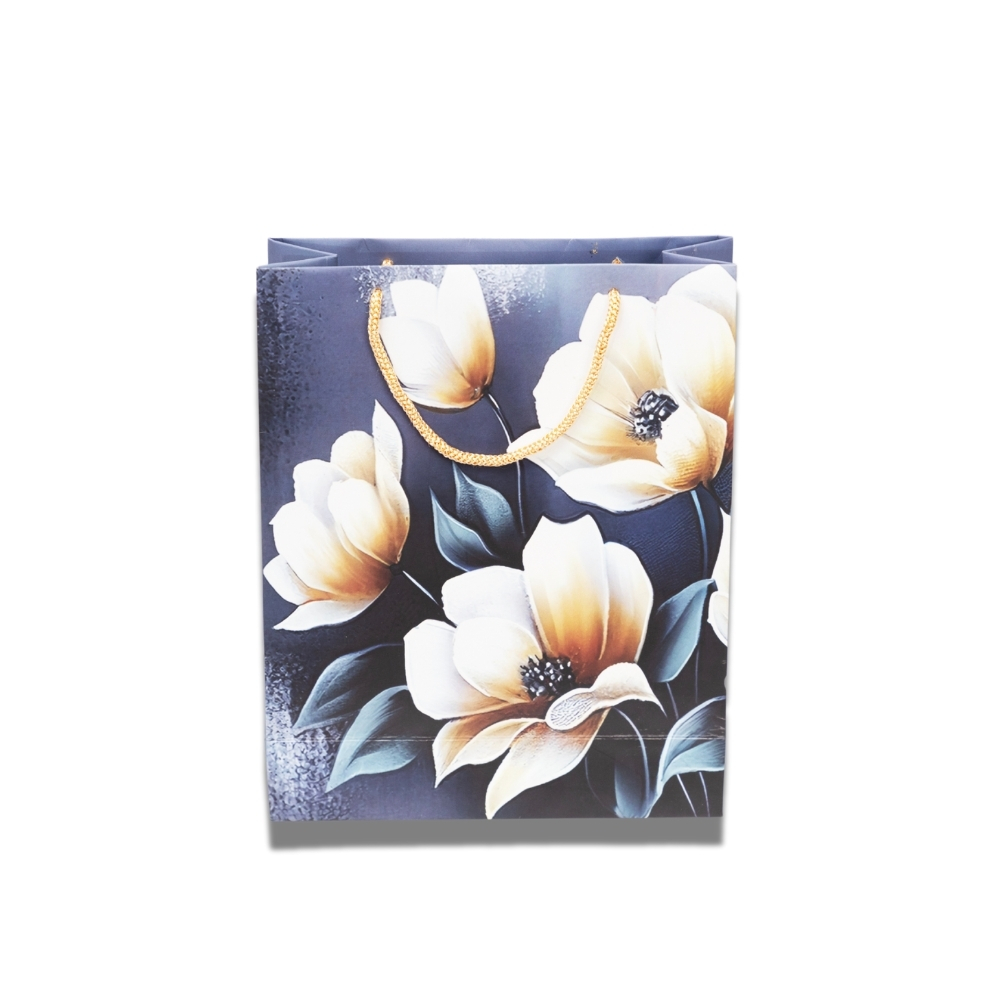 Present gifts beautifully with our elegant floral bag! Features soft white & yellow flowers on a rich dark blue background. Perfect for any special occasion.