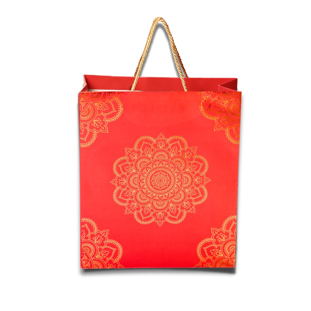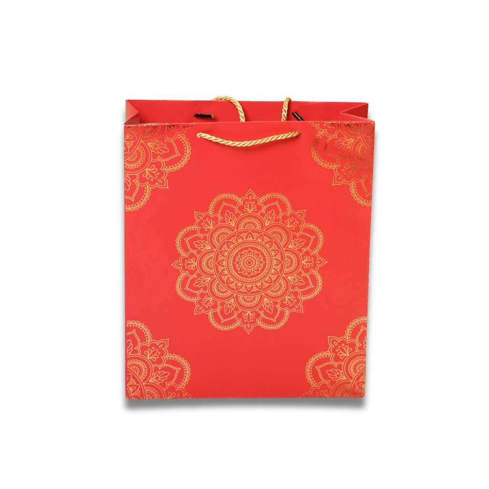 Present gifts beautifully with our vibrant red & gold foil gift bag. Featuring an intricate mandala design, sturdy twisted handles, and a premium finish — perfect for weddings, Diwali, and festive celebrations.