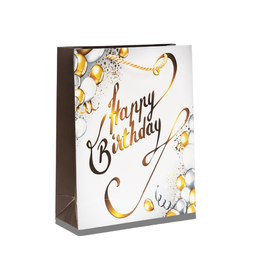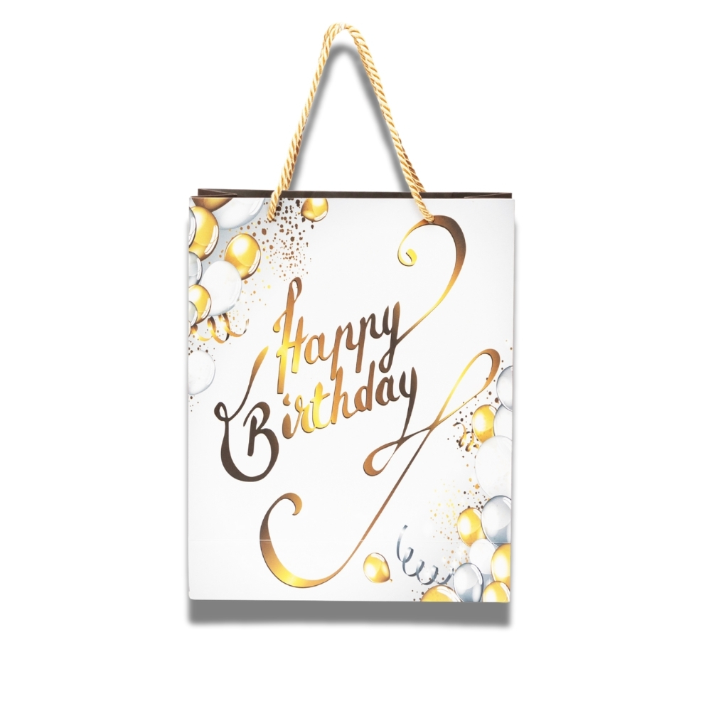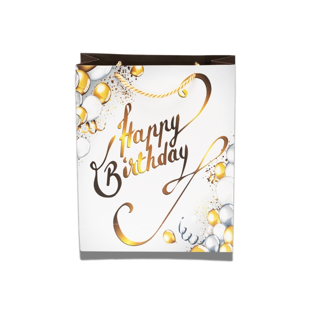 “Happy Birthday” Gift Bag – Gold & White Balloon Design