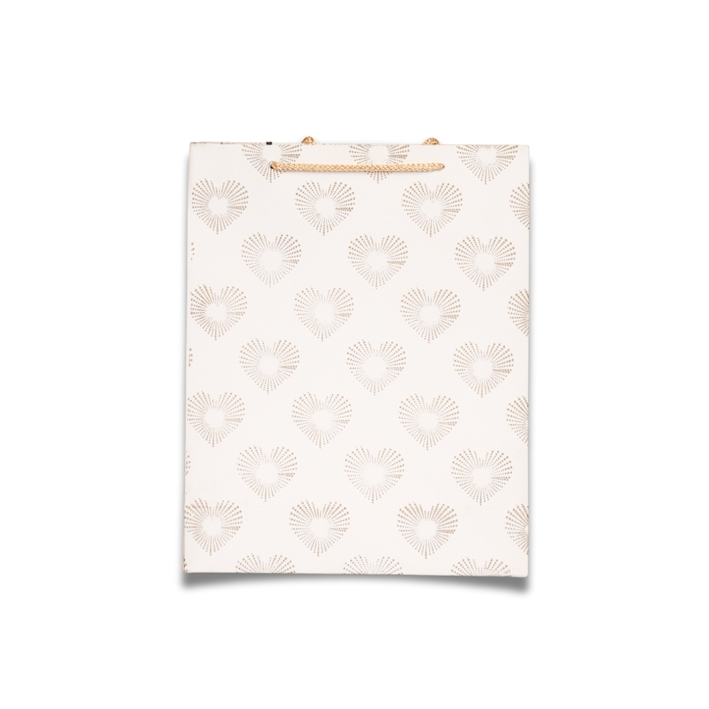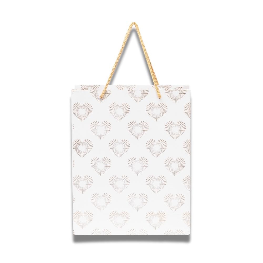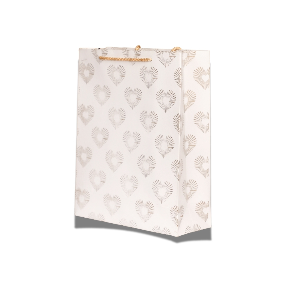 Show your love with our elegant white & gold heart pattern paper bag. Perfect for gifts of affection and special occasions. Shop now!